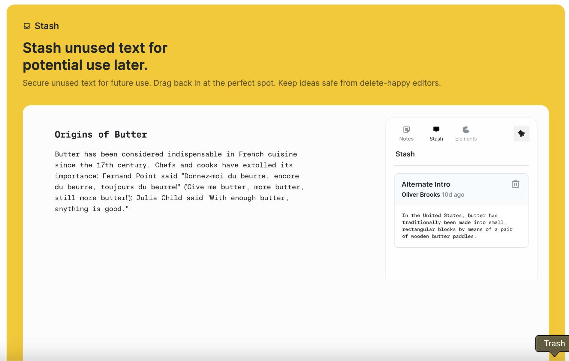 As I was clicking through ButterDocs’ site, the thing that really captured my attention was the Stash feature.
