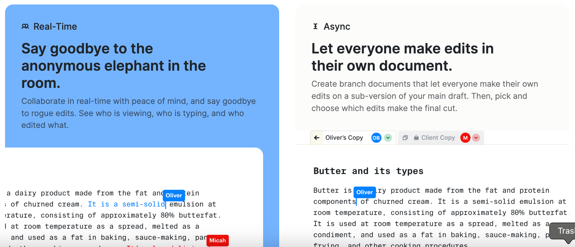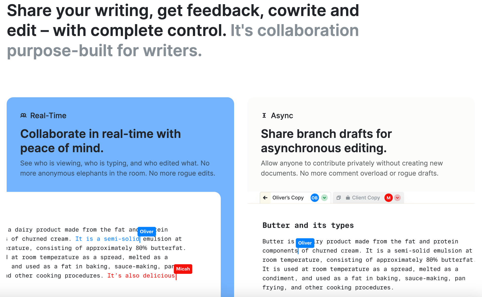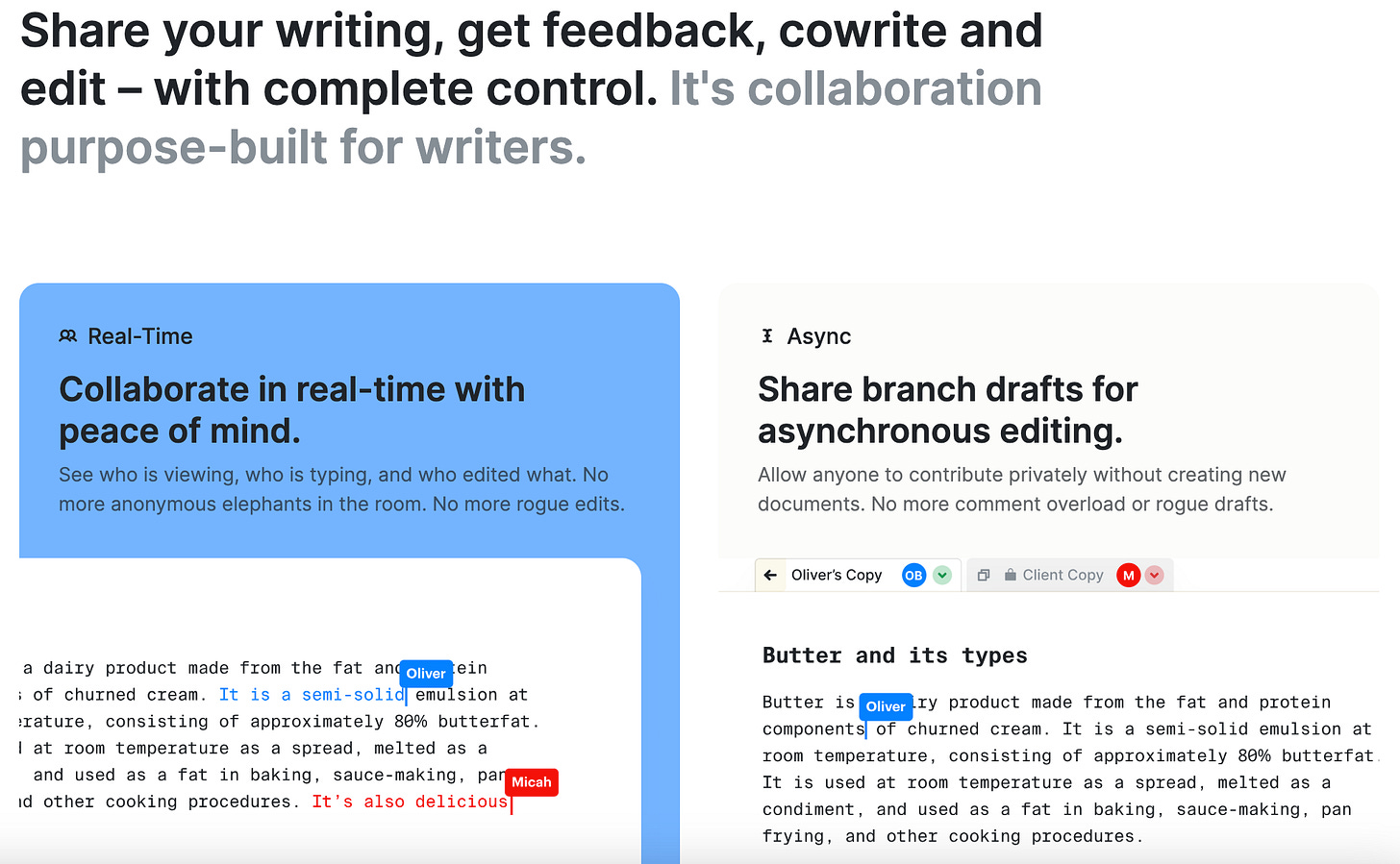 ButterDocs’ tone is a bit more direct than Google’s (even if they use more advanced vocabulary with words like “branch drafts” and “asynchronous”).