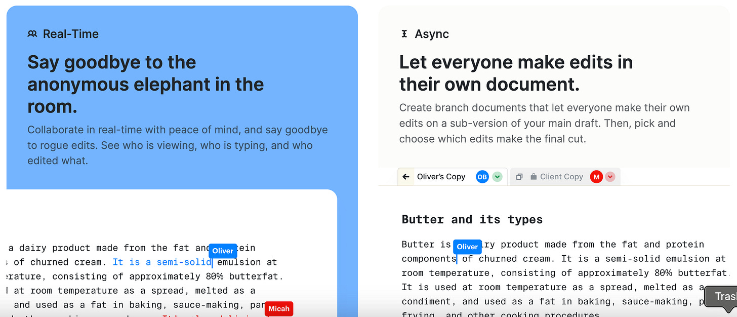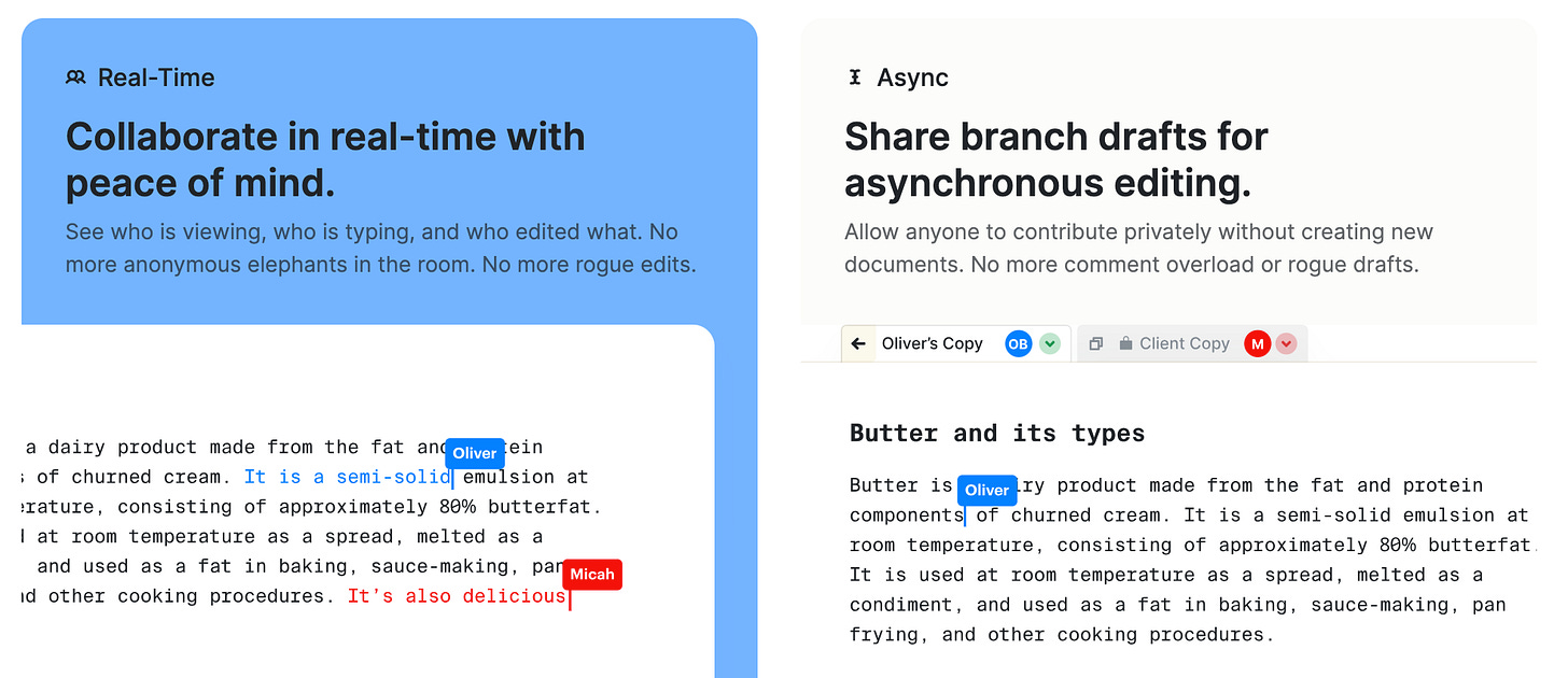 I’d also try to make them more educational on what the feature is before selling the value. Take a look at the Async section. As a writer I had no idea how to even think about that “branch documents” until I saw it in the demo.