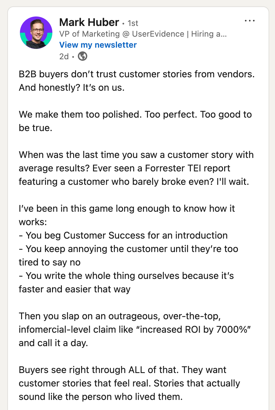 Their whole business is built around the insight that nobody in B2B really believes your customer case studies, and that buyers don’t trust vendor-created content anymore.